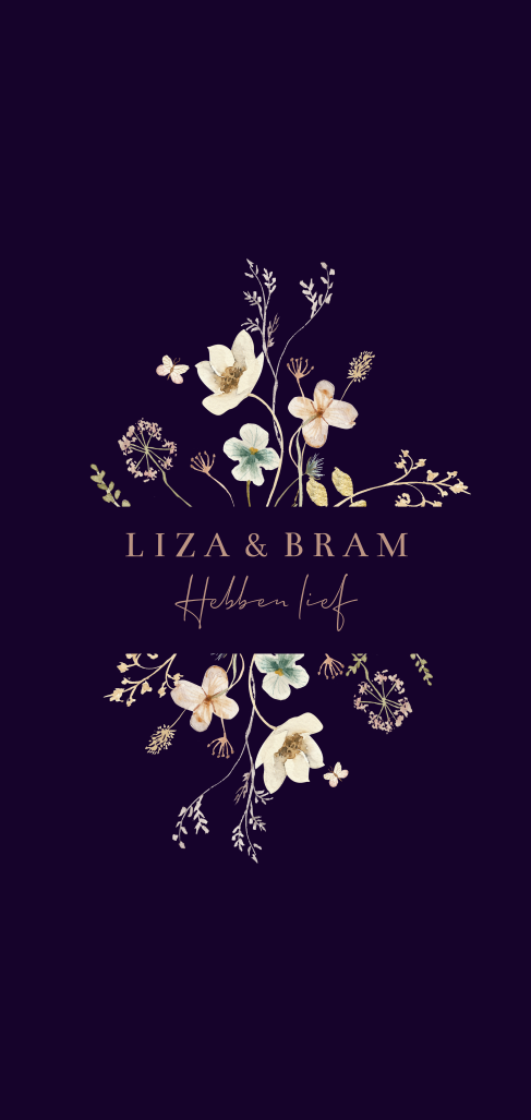Deze botanische trouwkaart met watercolour bloemen donkerblauw en roze kun je aanpassen naar wens voor jullie bruiloft.