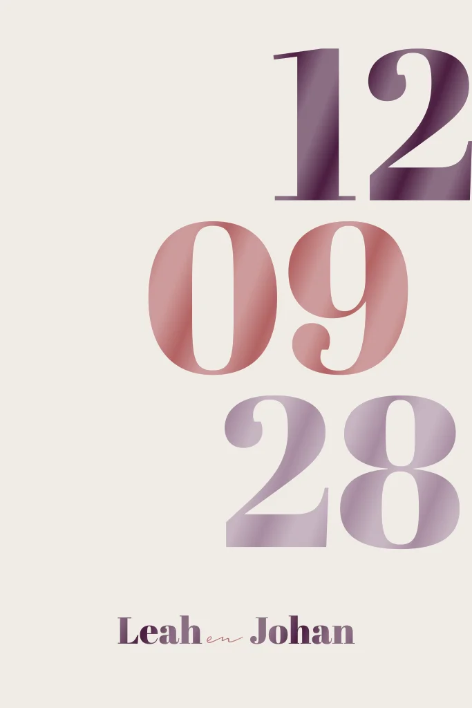 Trouwkaart met de datum in oranje paarse letters in lakfolie
