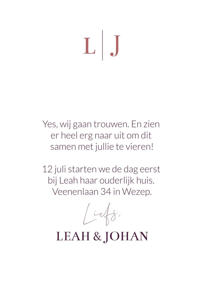 Deze minimalistische trouwkaart met de datum groot voorop in UV spotlak kun je zelf helemaal aanpassen naar wens en smaak. Leah & Johan