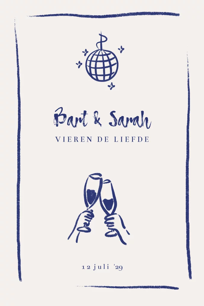 Deze trouwkaart met doodles van discobal en champagne wijn proosten kun je zelf helemaal aanpassen naar smaak :) Bart en Sara
