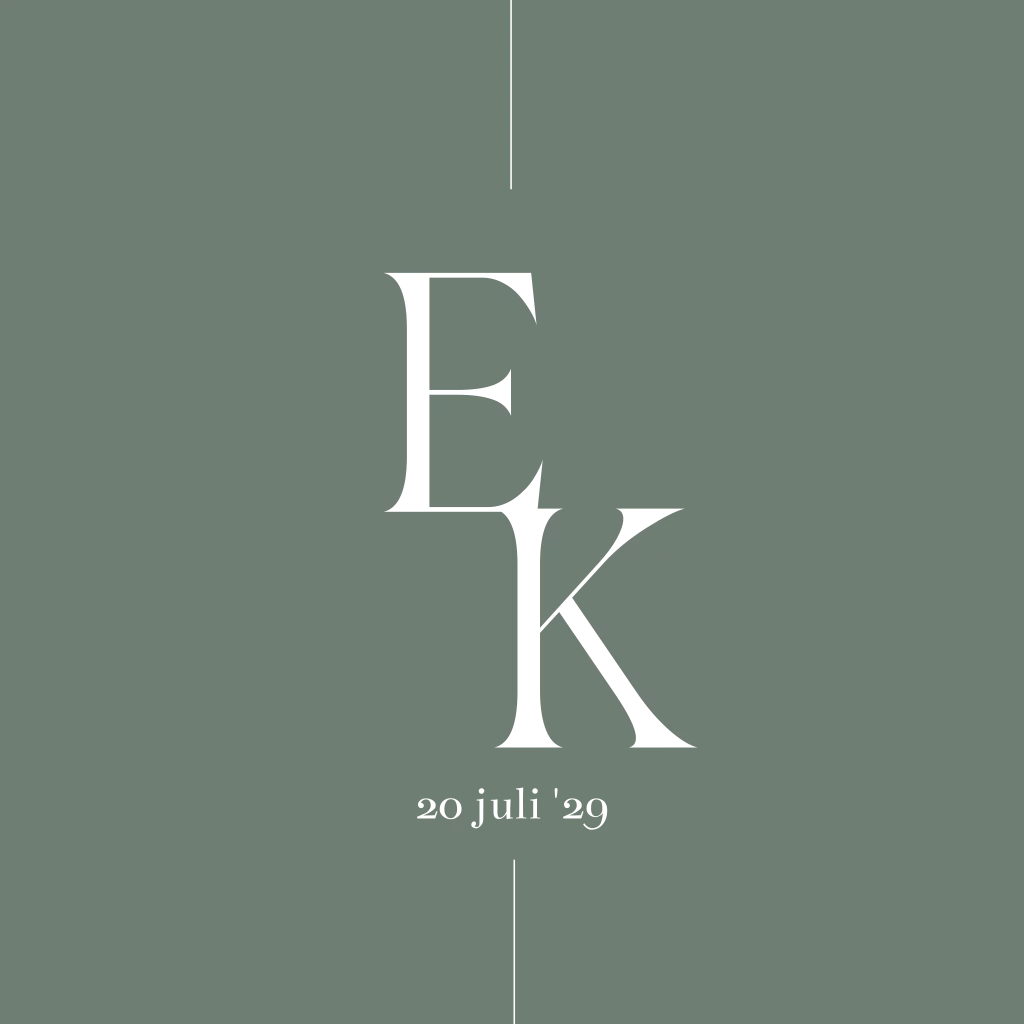 Een dubbele vierkante trouwkaart met de initialen van de naam in goudfolie. Minimalistisch klassiek met olijf groene achtergrond. Alles in dit kaartje kun je aanpassen naar wens en smaak, de kleuren, het lettertype en de teksten.