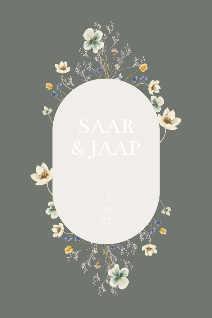 Deze trouwkaart met geschilderde bloemen kun je zelf aanpassen naar wens. De groen achtergrond kleur kun je aanpassen naar wens, net zoals het letterype en de foliedruk kleur.