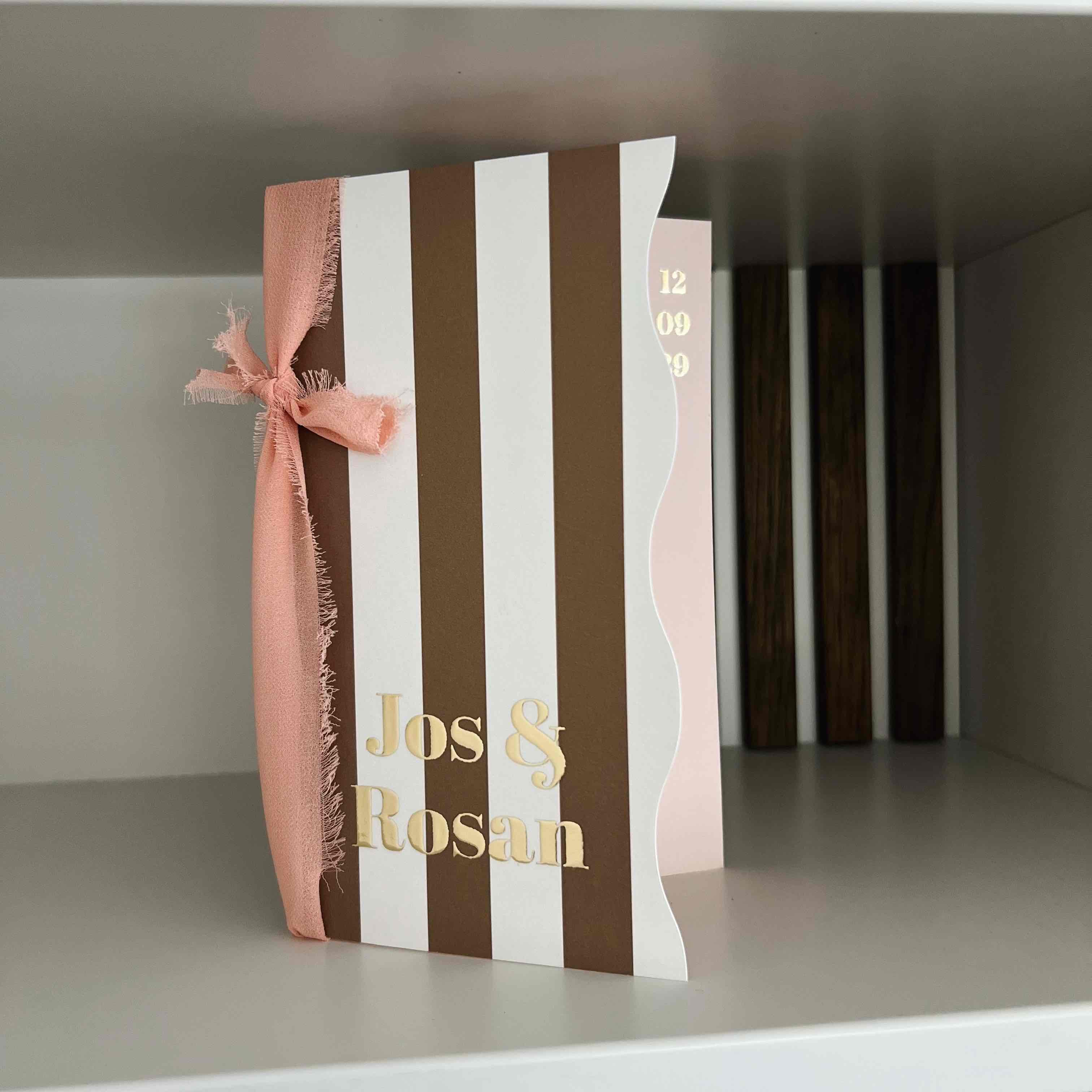 Deze trouwkaart met golvende rand en bruine beige strepen in combi met een roze binnenkant kun je helemaal aanpassen naar wens voor jullie bruiloft.