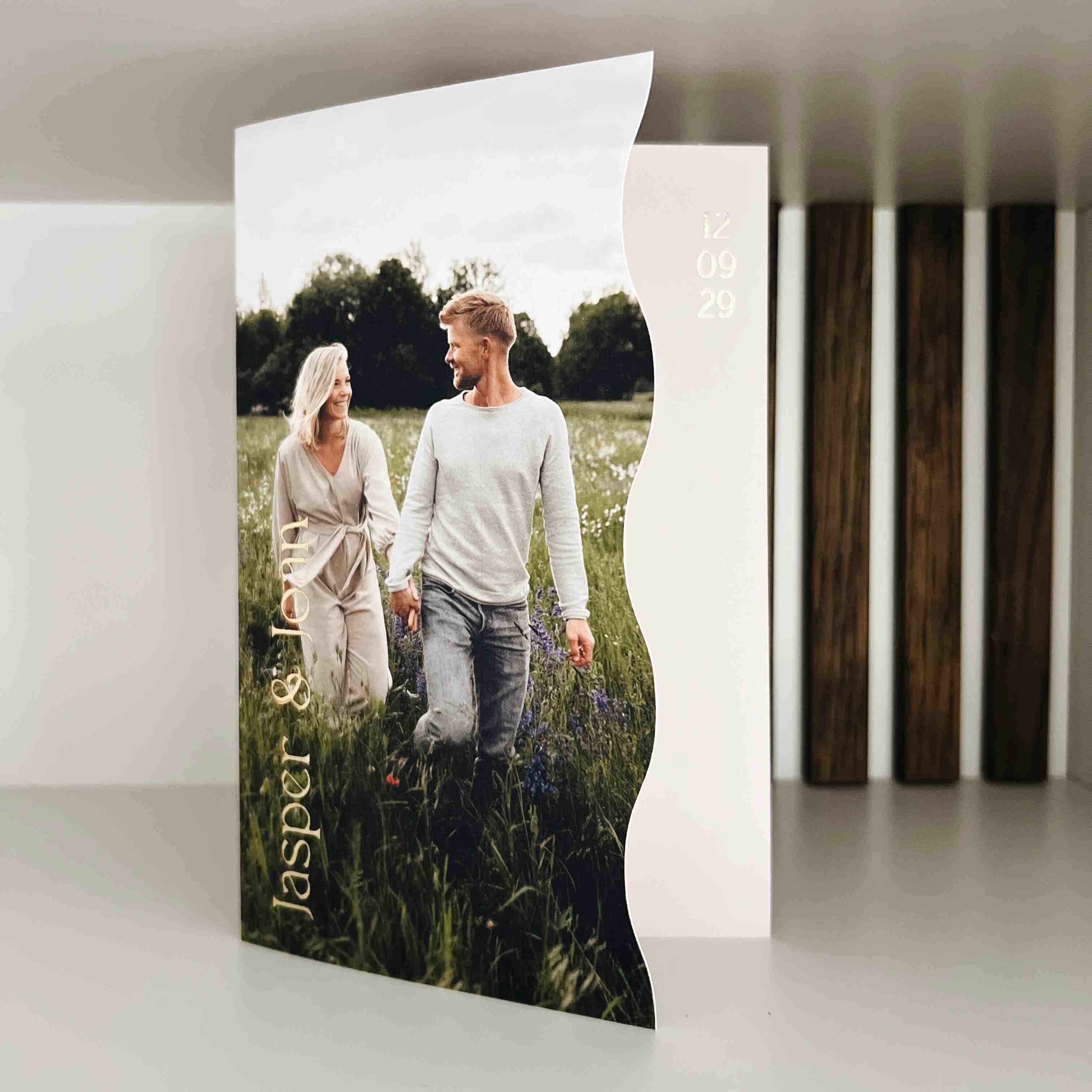 Natuurlijk met een mooie foto van jullie samen en eventueel met andere foliedruk kleuren in plaats van goudfolie.