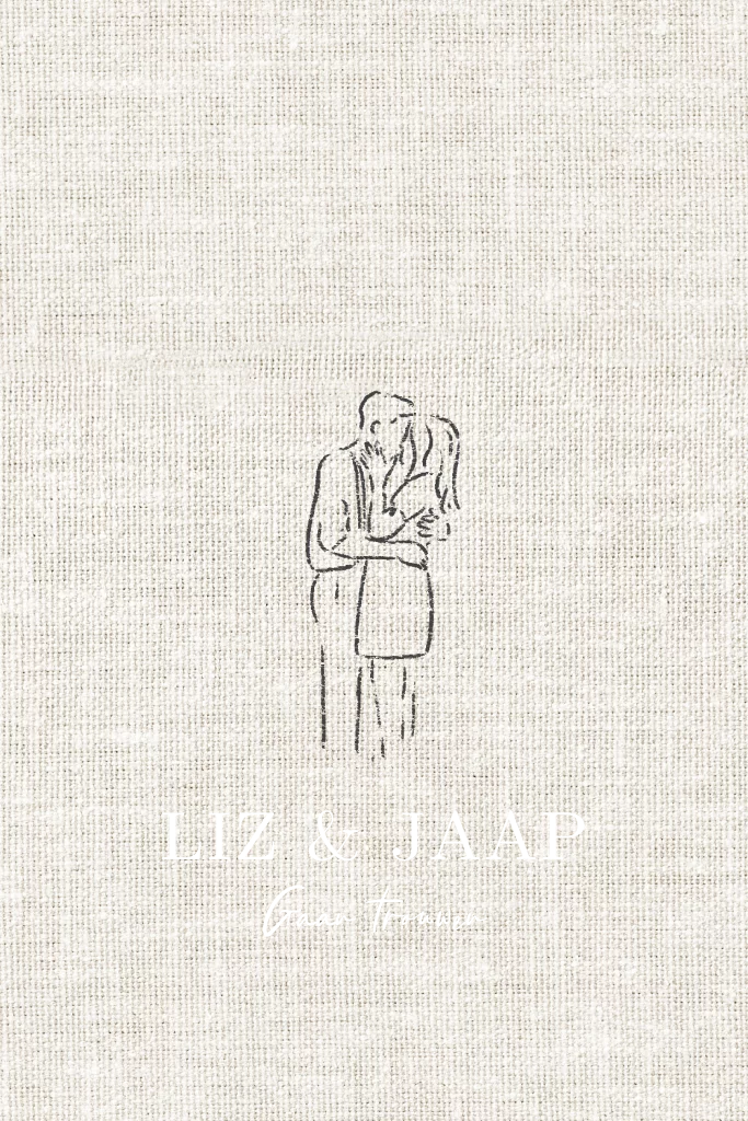 Deze eenvoudige klassieke trouwkaart met Linnen achtergrond en lijntekening voorop van een verliefd stel kunnen we aanpassen met een lijntekening van jullie samen.