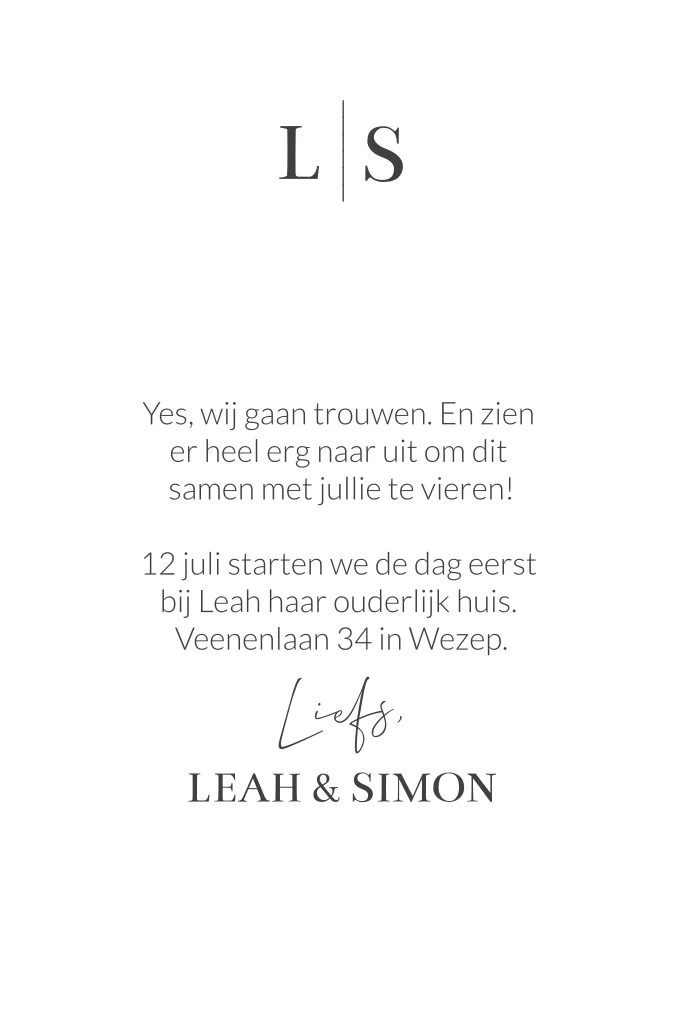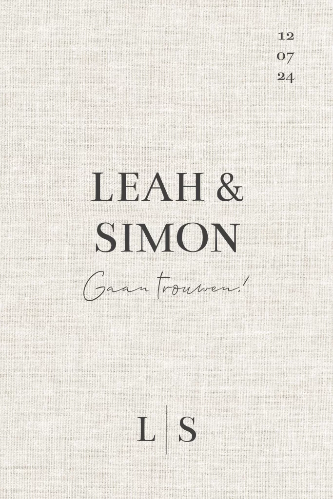 Een minimalistische trouwkaart met linnen achtergrond met initialen en donkergrijze letters.