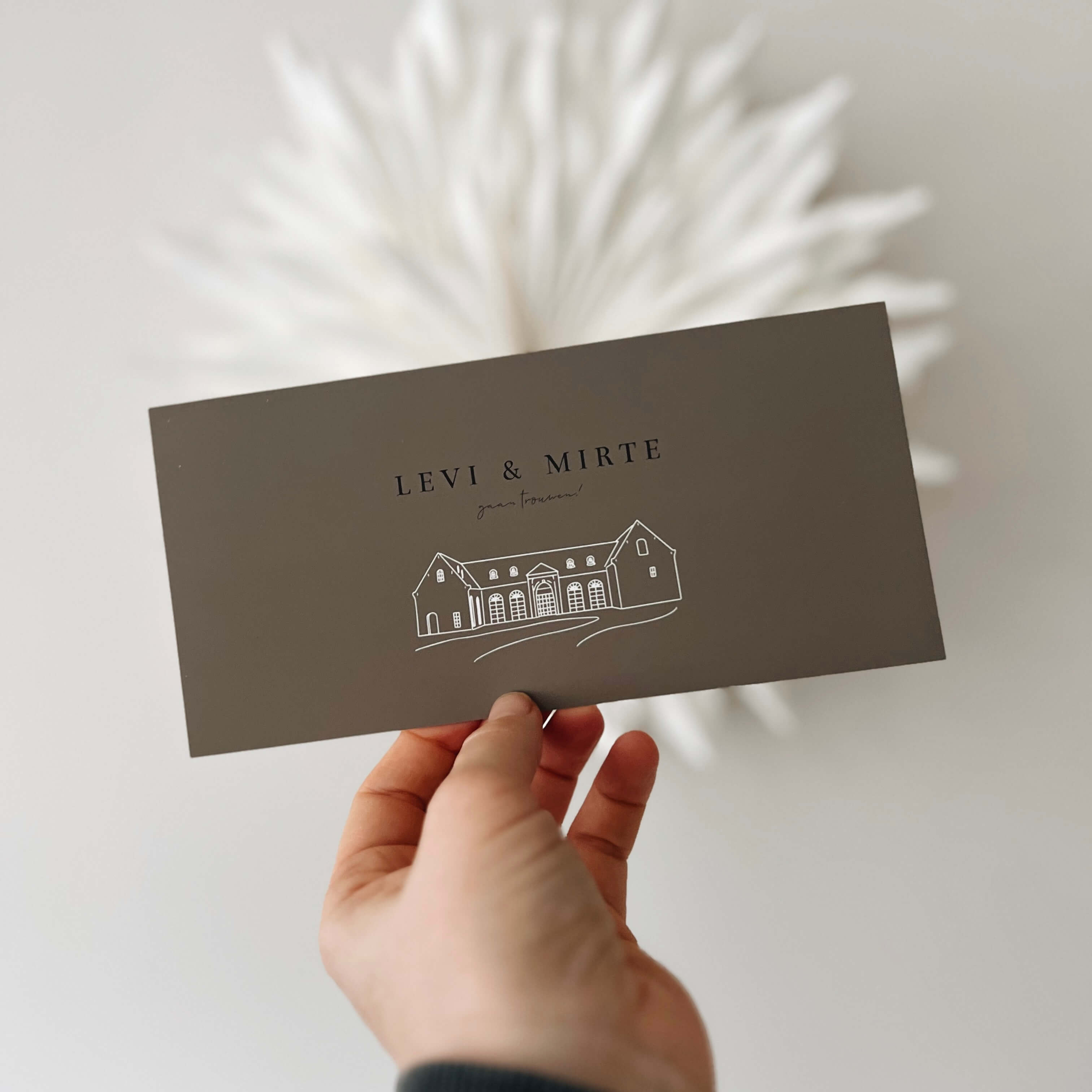Een minimalistische trouwkaart met lijntekening van de trouwlocatie voorop.