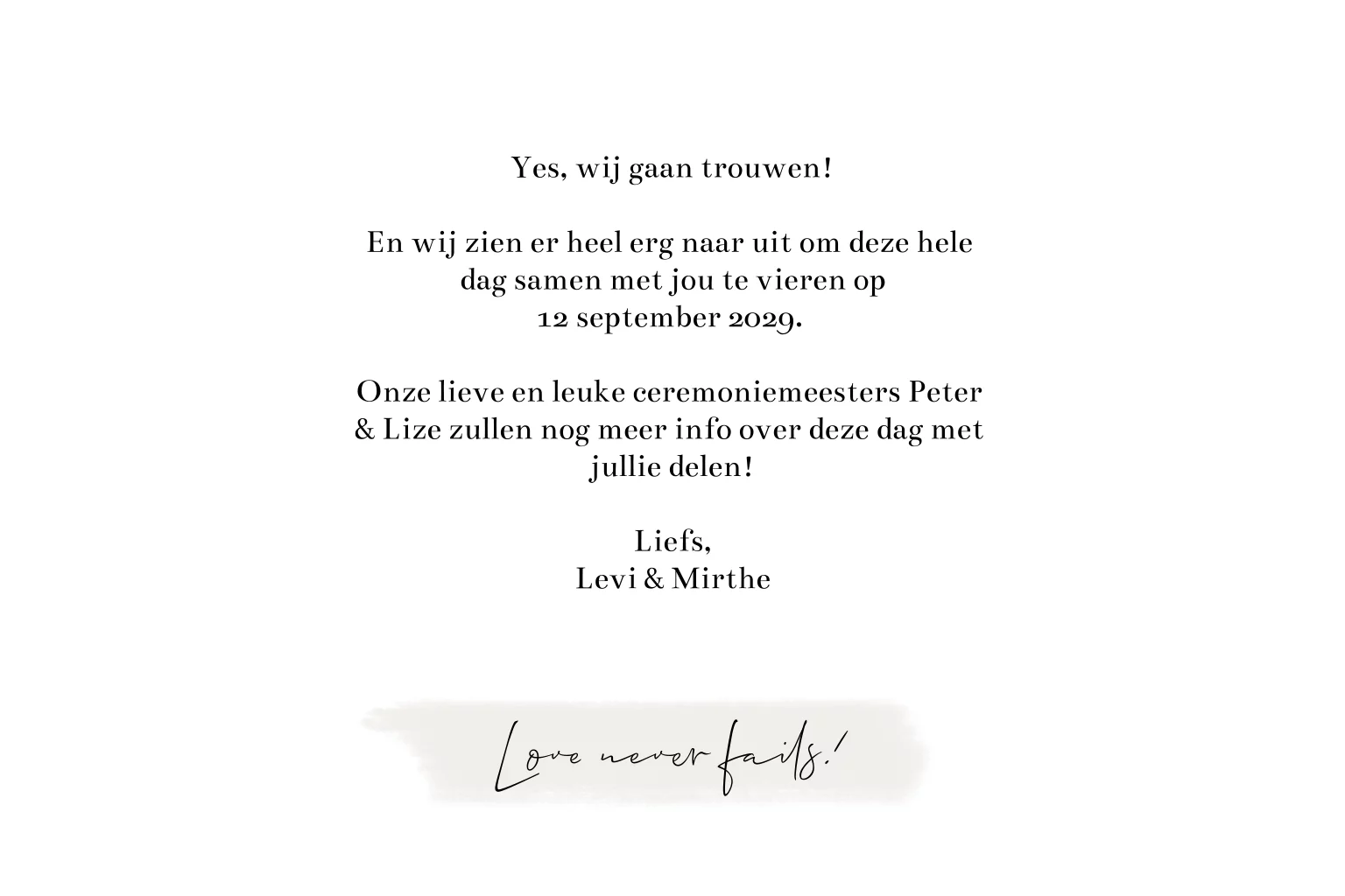 Op zoek naar een minimalistische trouwkaart met een unieke lijntekening van jullie trouwlocatie? Zoek niet verder! Onze trouwkaart met de prachtige lijntekening van De Molen in Kesteren is de perfecte keuze voor stellen die houden van eenvoud en stijl. De strakke lijnen en het minimalistische ontwerp stralen rust en elegantie uit, waardoor deze kaart perfect past bij een klassieke, moderne of rustieke bruiloft. Het beste van alles is dat we deze trouwkaart volledig op maat kunnen maken, zodat het perfect aansluit bij jullie wensen en trouwlocatie. Of het nu gaat om aanpassingen aan de typografie, het toevoegen van specifieke details of het gebruik van andere kleuren, wij zorgen ervoor dat jullie trouwkaart echt uniek is. Met een clean en tijdloos ontwerp, is deze trouwkaart geschikt voor stellen die op zoek zijn naar een stijlvolle aankondiging van hun grote dag. De combinatie van wit, zilver en zwart zorgt voor een luxe uitstraling, terwijl het gebruik van zwart-wit en zwartfolie een vleugje moderniteit toevoegt. Heb je interesse in deze prachtige trouwkaart of wil je meer informatie over de mogelijkheden voor maatwerk? Neem dan gerust contact met ons op via serviceteam@zojoann.nl. We staan klaar om jullie te helpen bij het creëren van de perfecte trouwkaart die jullie liefdesverhaal weerspiegelt. Maak een blijvende indruk met onze minimalistische trouwkaart met lijntekening van jullie trouwlocatie.