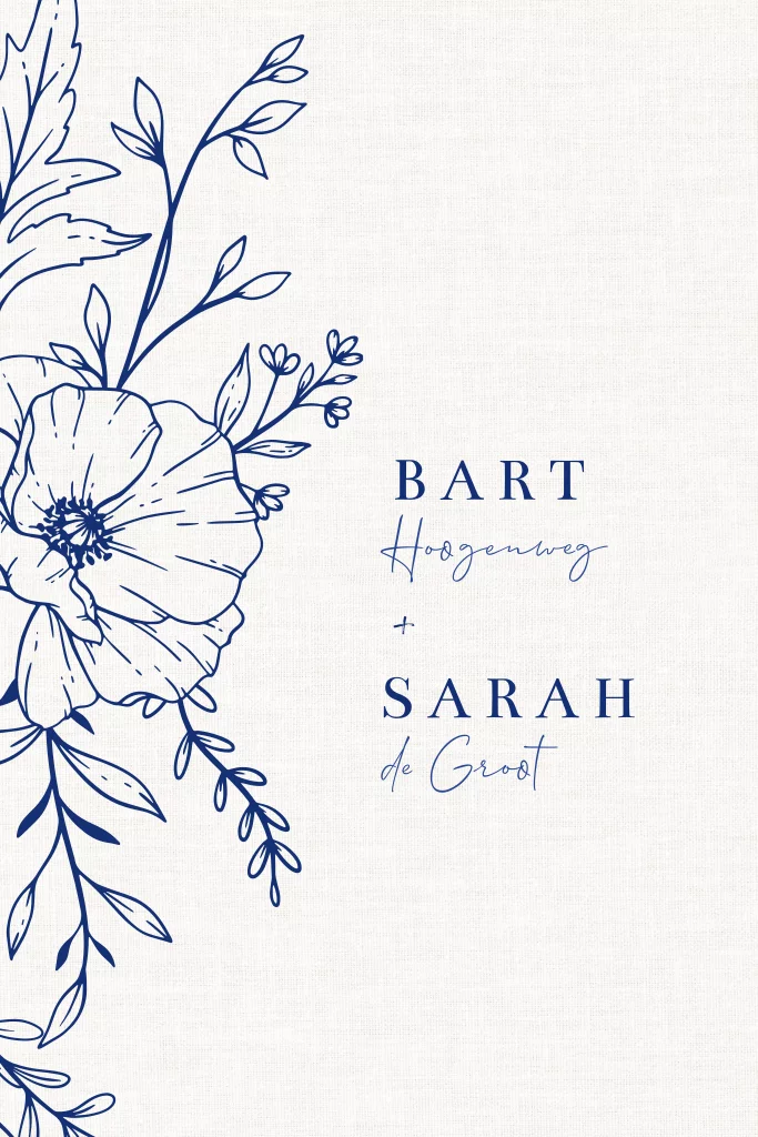 Deze trouwkaart met lijntekening van blauwe bloemen kun je zelf helemaal aanpassen naar wens. Bart & Sarah