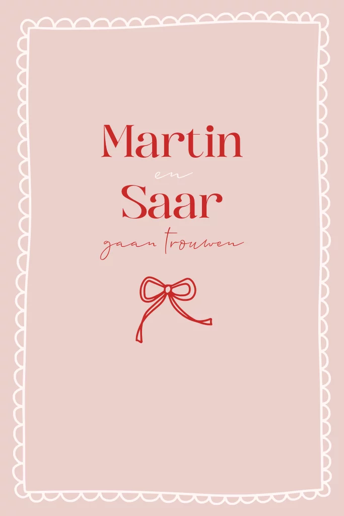 Deze vrolijke trouwkaart in roze en rode kleuren met een strikje en een leuke golfjes rand kun je helemaal aanpassen naar wens en smaak. Mart & Saar