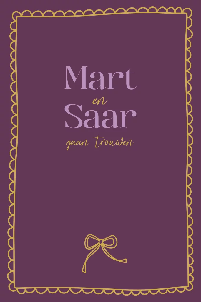 Deze trouwkaart met in aubergine paars, lila en oker kleuren kun je zelf aanpassen naar wens en smaak. Ook het strikje kun je vergroten, verkleinen ed.