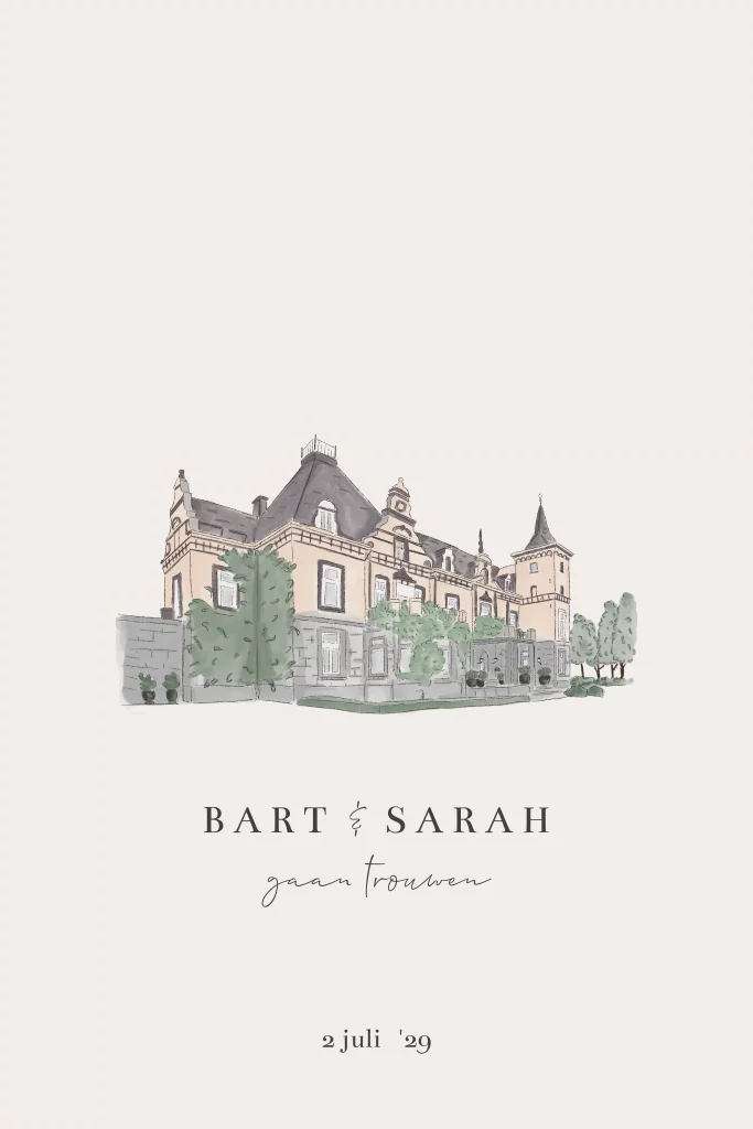 Een mooie trouwkaart met jullie trouwlocatie in watercolour voorop de kaart.