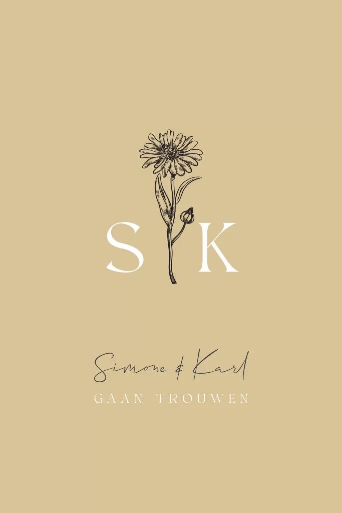 Deze mooie minimalistische trouwkaart met zonnebloem en initialen kun je aanpassen. Het lettertype maar ook de gele achtergrond. Zo maak je een unieke trouwkaart.