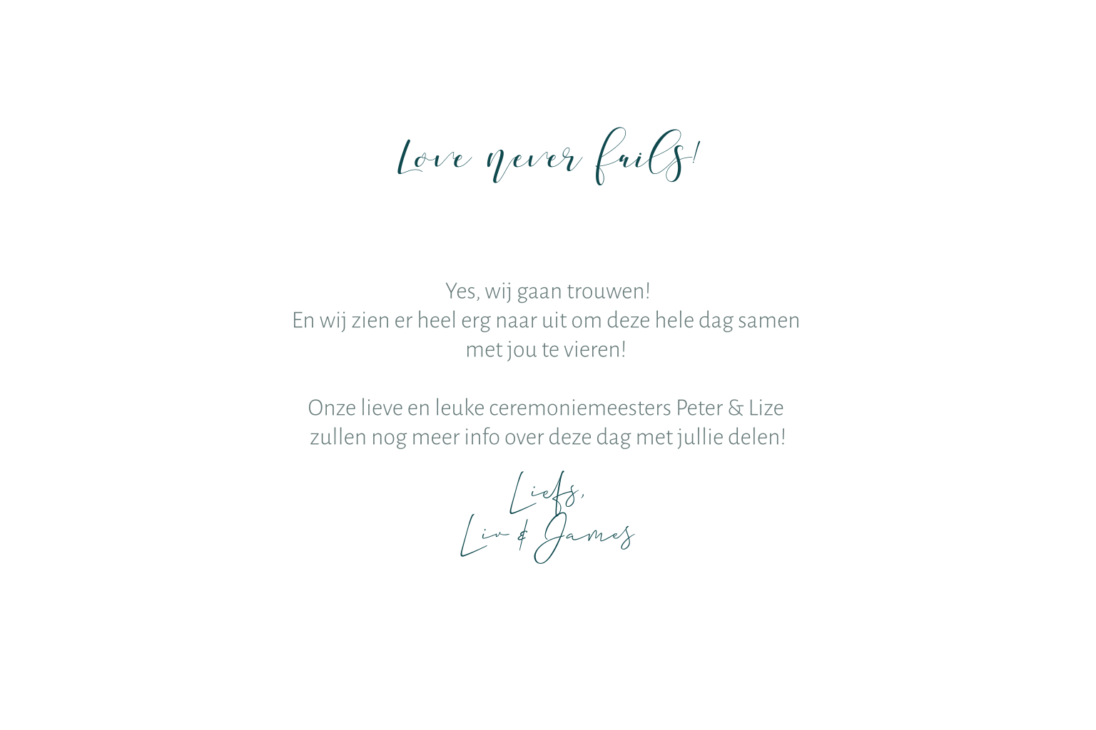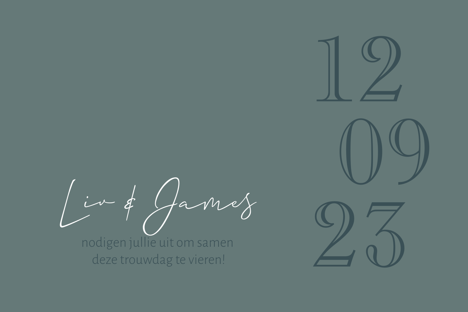 Een rustige minimalistische trouwkaart waarbij de datum goed zichtbaar is. De groene kleur en alle lettertypes kun je aanpassen naar wens. Liv & James