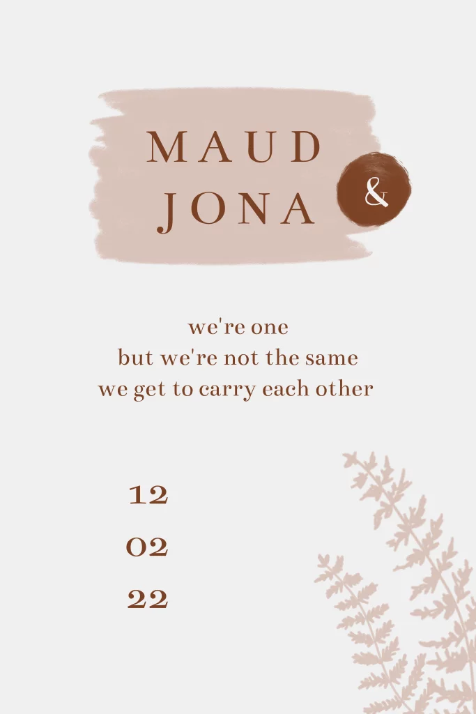 Deze minimalistische trouwkaart met oud roze takje en verfstreepjes kun je zelf helemaal aanpassen naar wens en smaak. Je zou bijvoorbeeld nog goudfolie of koperfolie toe kunnen voegen. Mocht je dit willen dan helpen we je hier graag bij. Bekijk ook de bijpassende menukaart, save the date kaart en andere kaartjes van deze trouwhuisstijl.