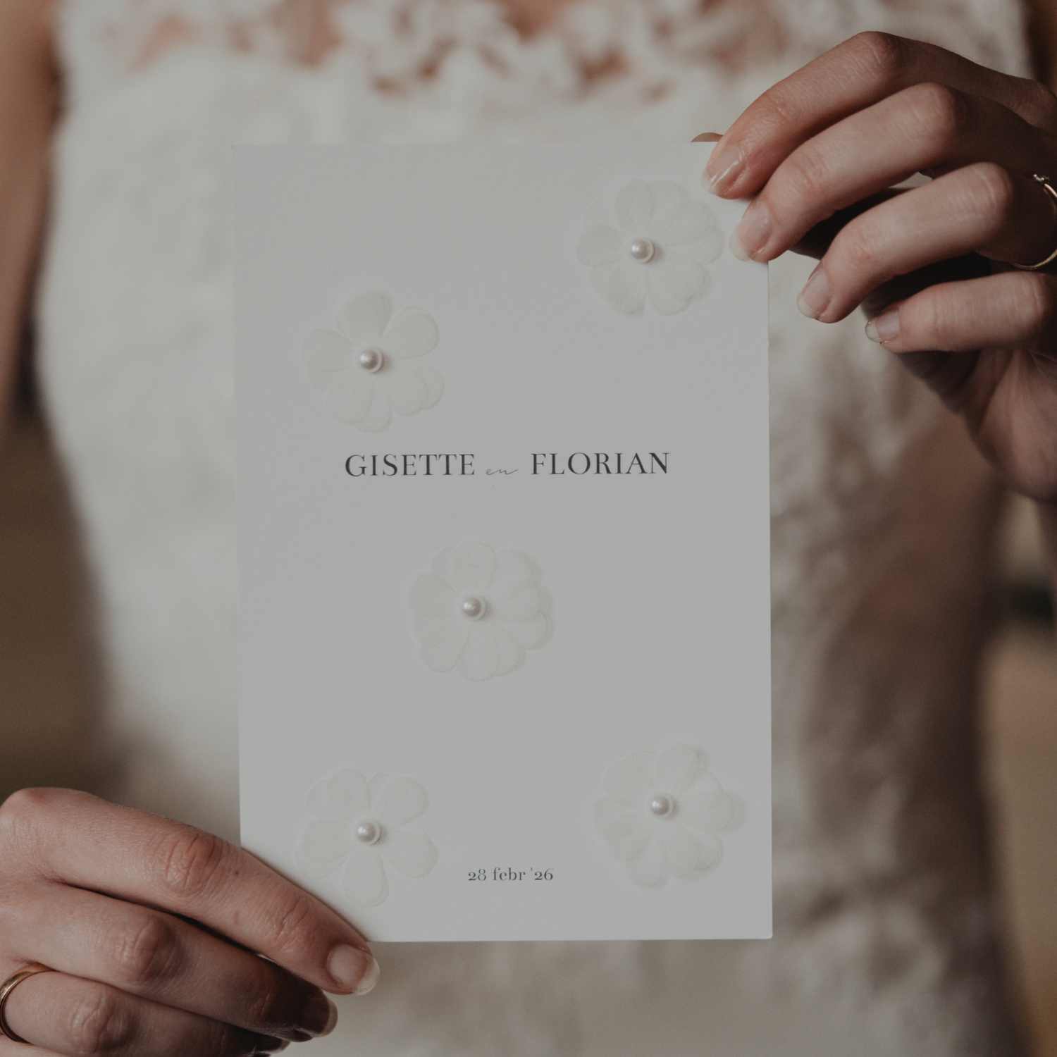De trouwkaart is minimalistisch en klassiek. Er kunnen witte bloemen of pareltjes opgeplakt worden. Deze worden er niet bijgeleverd. Maar mocht je dit willen dan mag je mailen naar serviceteam@zojoann.nl.