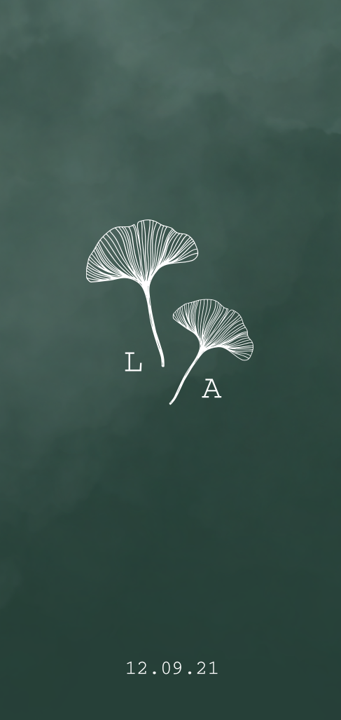 Deze trouwkaart met donkergroene achtergrond en Ginkgo bladeren in goudfolie past heel mooi bij de rest van de huisstijl op deze site. Je kunt het kaartje zelf aanpassen naar wens. En jullie eigen initialen aanpassen op deze kaart.