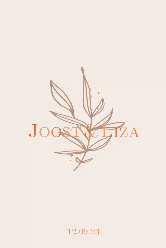 Trouwkaart met lijntekening takje in aardetinten en koperfolie