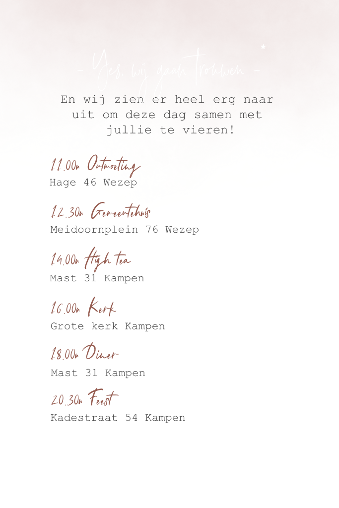 Deze trouwkaart met maan, sterren en tekst in goudfolie kun je ook omzetten in koperfolie of zilverfolie. Ook de roestbruin rode achtergrond kun je aanpassen naar elke willekeurige kleur. Op Linnen papier komt deze kaart prachtig tot zijn recht en heb je een mooie kaart om jullie bruiloft aan te kondigen.