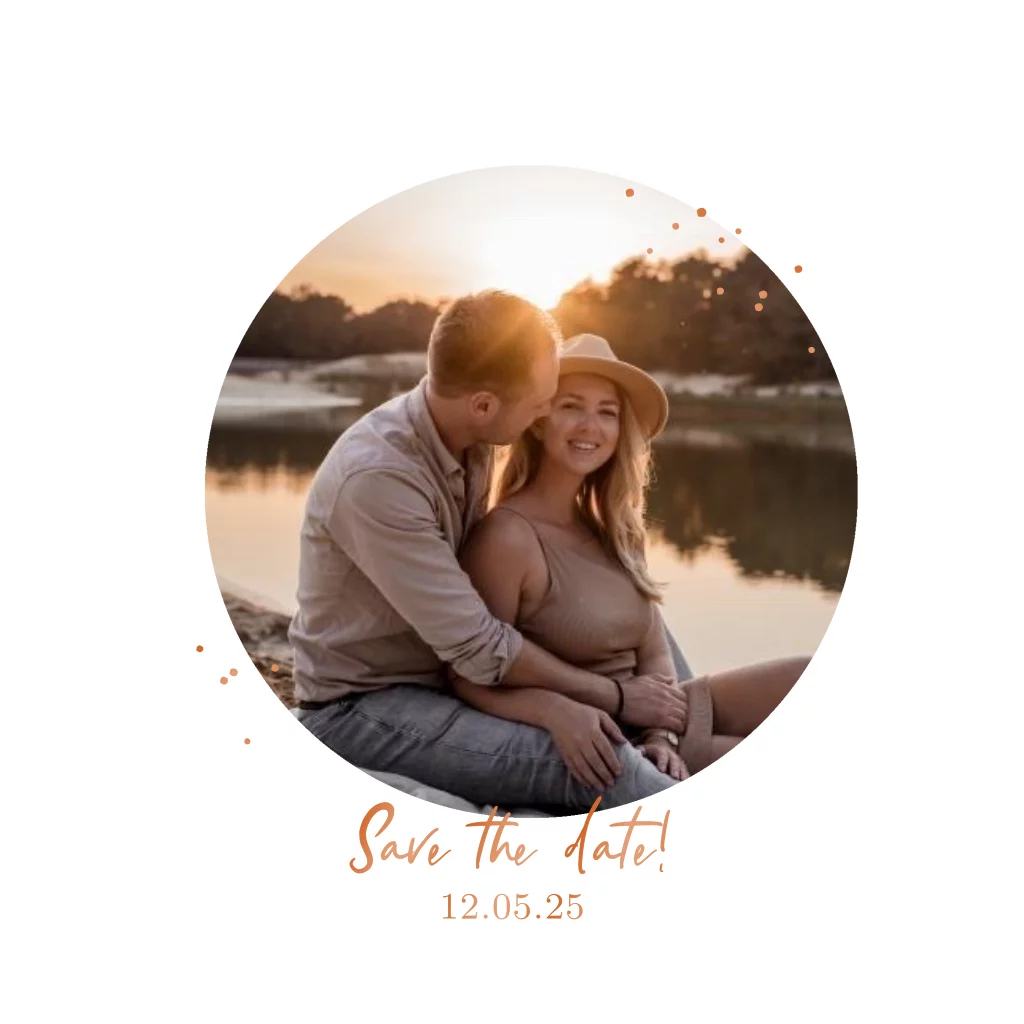Deze Save the date kaart met een foto van jullie in een rondje kun je helemaal aanpassen naar wens. Bekijk ook de bijpassende trouwkaart om de hele huisstijl voor jullie bruiloft compleet te maken.