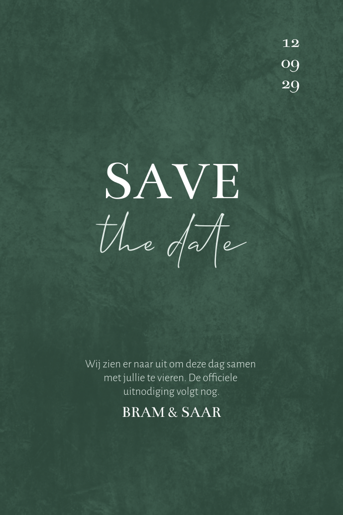 Save the date kaart minimalistisch groen velvet look goudfolie