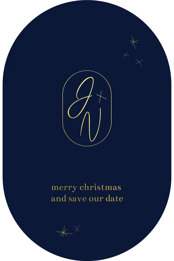 Save the date kerstkaart ovalen vorm met goudfolie sterretjes en logo