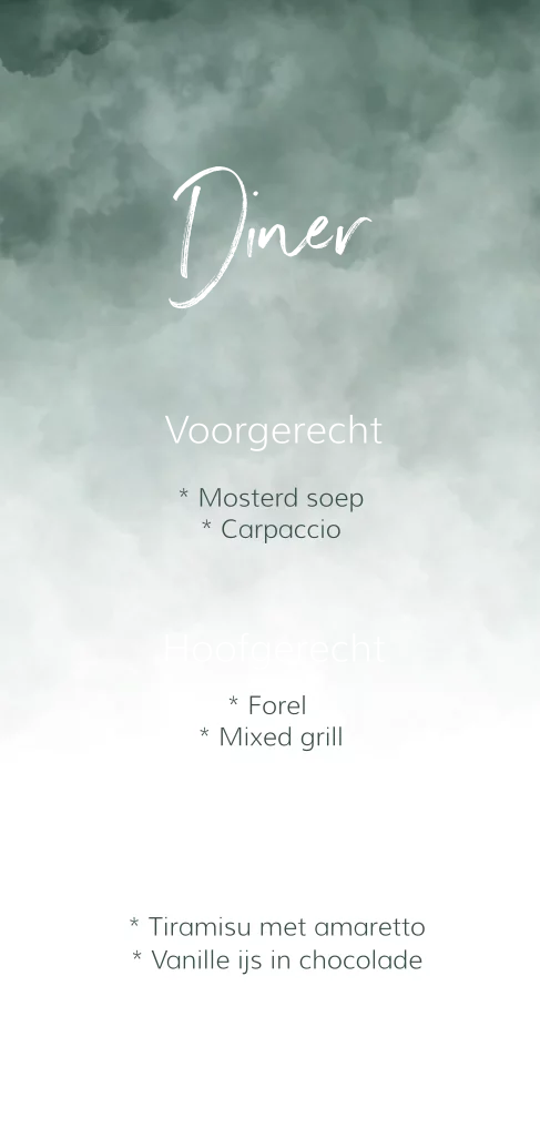 Een diner kaart op de borden geeft net wat extra's aan jullie trouwdag. Deze menu kaart past bij de huisstijl van de trouwkaart