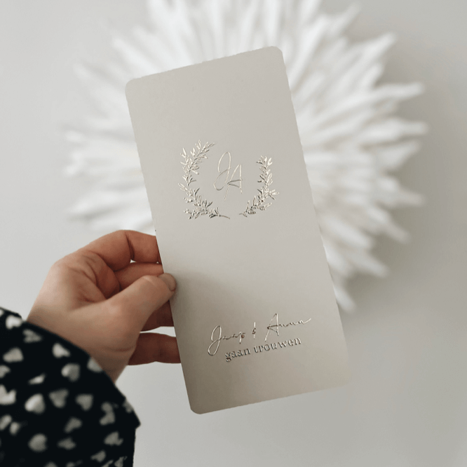 Klassieke trouwkaart met krans in goudfolie met initialen van de namen erin. Alles in deze kaart kun je aanpassen naar wens.