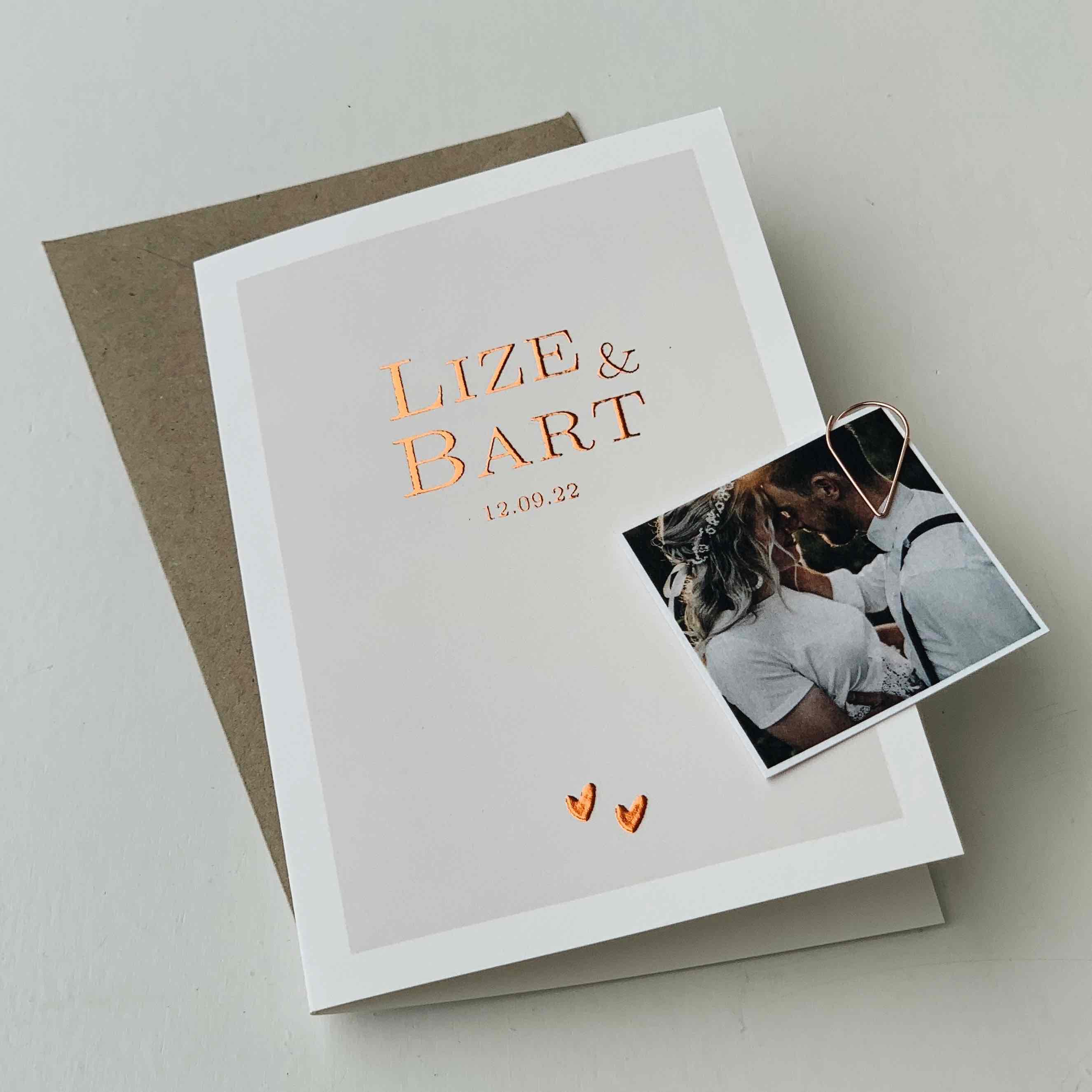 Minimalistische trouwkaart met aardetinten en koperfolie