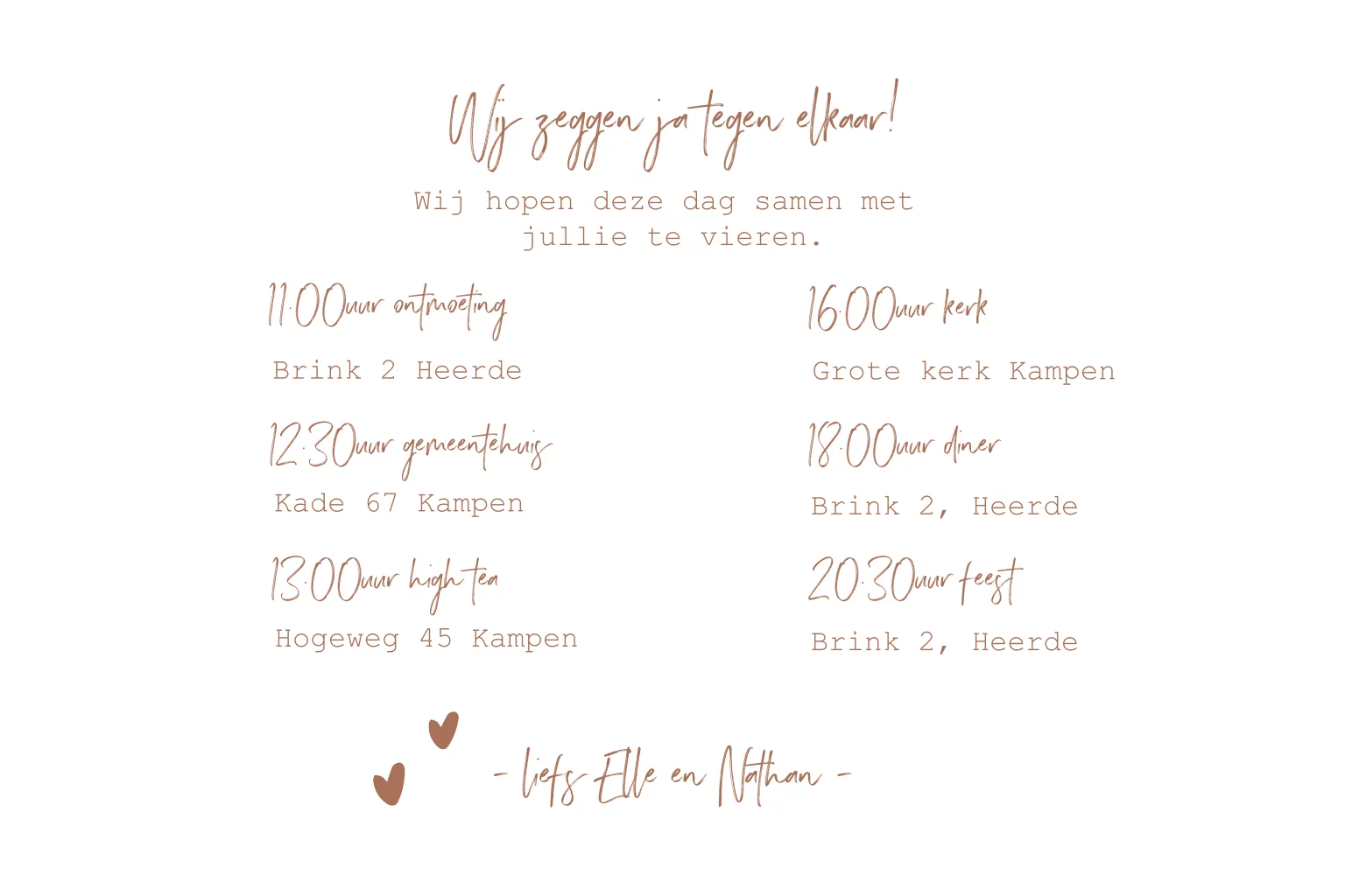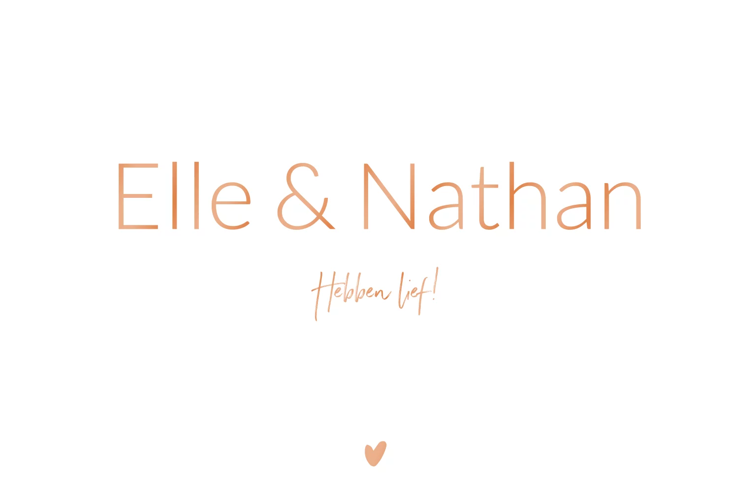 Deze minimalistische trouwkaart heeft een chique uitstraling door de koperkleurige UV spotlak. Het folie kun je ook omzetten naar goudfolie of zilverfolie. De achtergrond kleuren en de tekst kleuren kun je ook allemaal aanpassen.