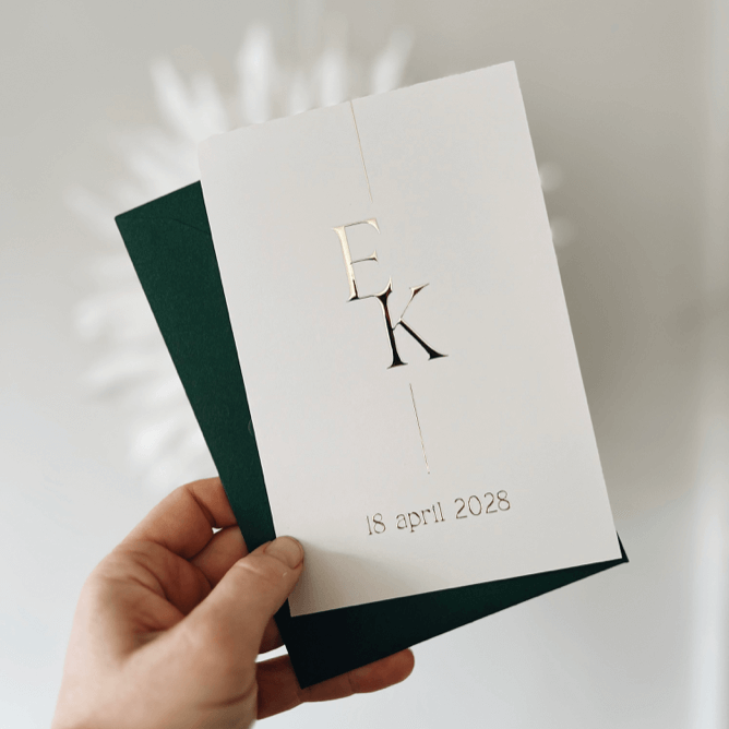 Deze prachtige minimalistische trouwkaart met goudfolie kun je aanpassen naar wens. Door jullie initialen op deze manier op een kaart te zetten creëer je gelijk een logo. Je kan dus gemakkelijk zelf aan de slag met de kaart. Vragen over mogelijkheden? Je kan ons altijd mailen via serviceteam@zojoann.nl of bellen!