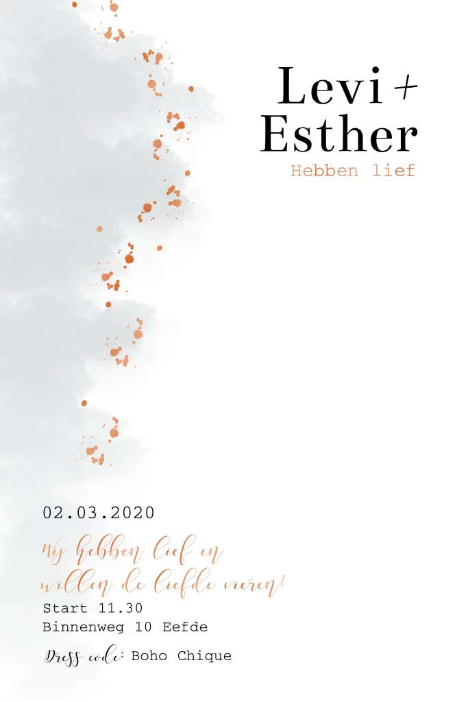 Een trouwkaart met blauwe wolken en tekst en spetters in koperfolie. Natuurlijk kun je alles aanpassen naar wens. De koperkleurige UV spotlak kun je ook aanpassen in zilverfolie of goudfolie.