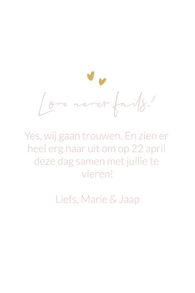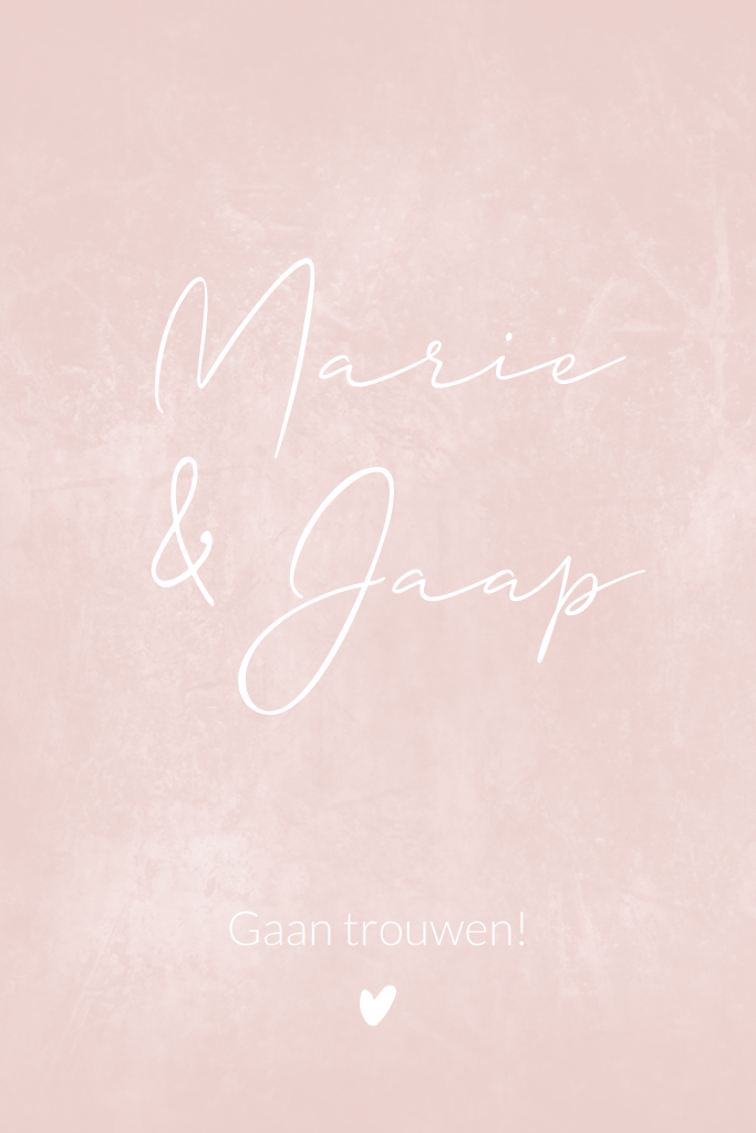 Trouwkaart in zalm roze velvet look met tekst en hartje in goudfolie