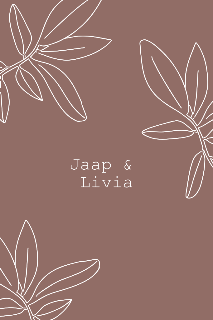 Trouwkaart met bladeren in goudfolie en roestbruine achtergrond