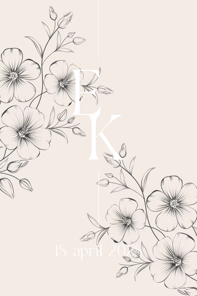 Een minimalistische trouwkaart met zwart wit getekende bloemen boeket op de achtergrond met initialen in goudfolie ervoor.