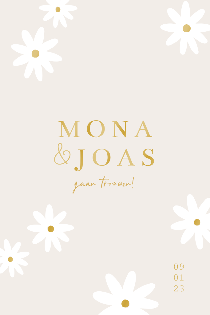 Deze trouwkaart met witte madeliefjes in UV spotlak kun je zelf helemaal aanpassen naar wens en smaak voor jullie bruiloft.