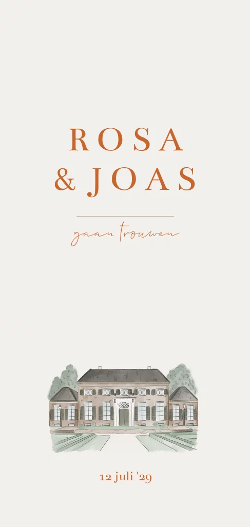 Deze trouwkaart met trouwlocatie kan helemaal aangepast worden naar wens. We kunnen ook een mooie tekening maken van jullie eigen locatie.
