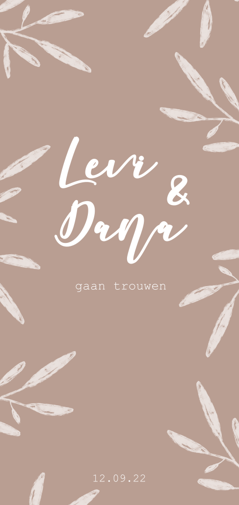 Deze langwerpige trouwkaart met oud roze achtergrond, witte takjes en tekst in goudfolie kun je zelf aanpassen naar wens. De kleuren en het lettertype. Je kunt takjes weghalen of juist kopiëren en erbij plakken.