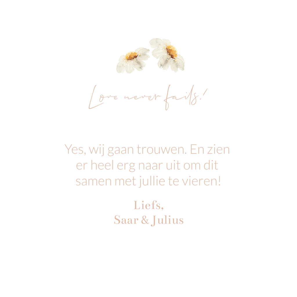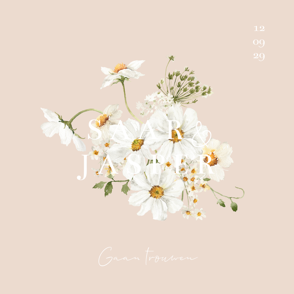 Deze trouwkaart met madeliefjes en takjes kun je zelf aanpassen naar wens. De tekst voorop is in roséfolie en ook de foliekleur kun je aanpassen.