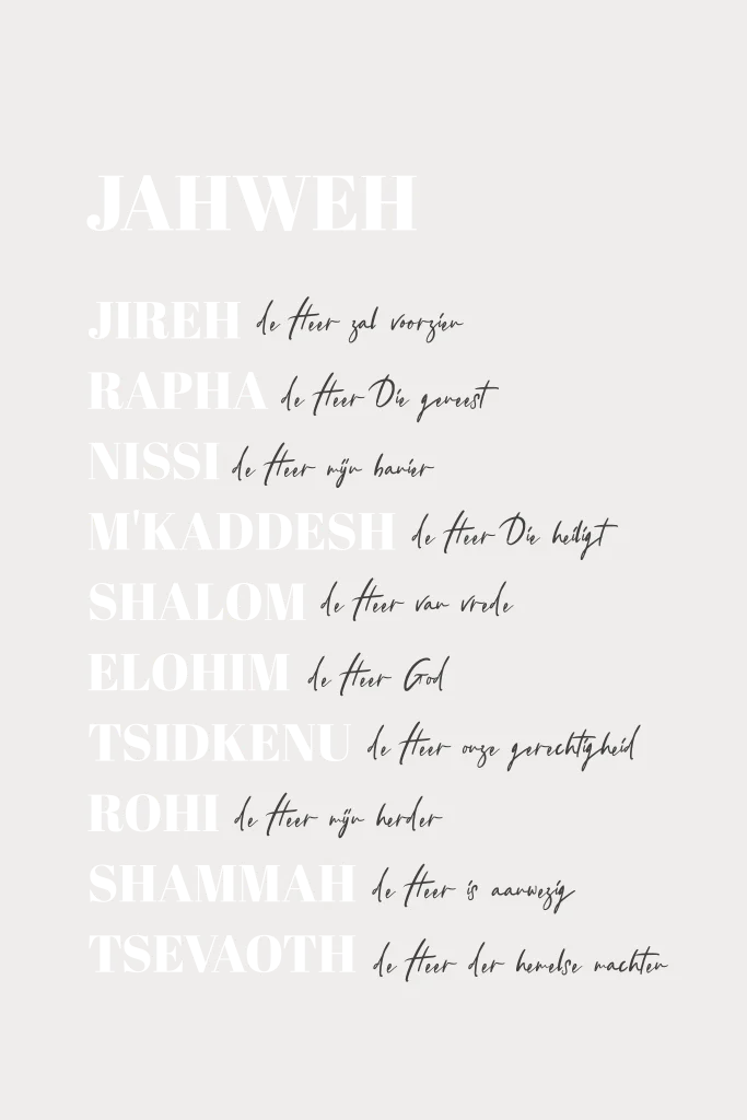 Deze kaart met de namen van God Jahweh in het Hebreeuws in goudfoliedruk kun je drukken in verschillende formaten. Van Ansichtkaart A6 tot Maximaal A5.